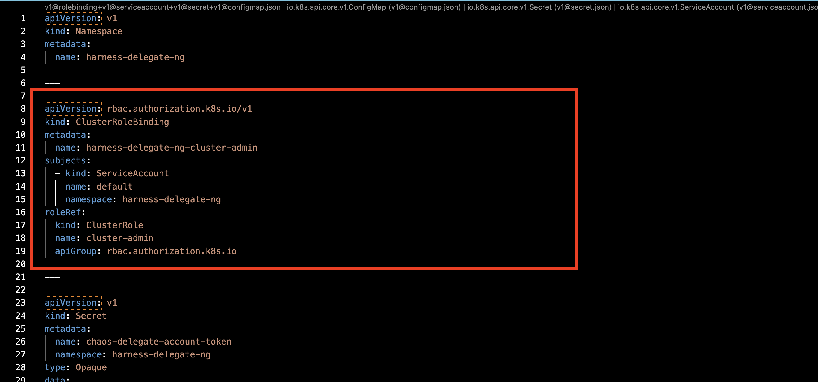 Attach the service account you created earlier to the Delegate YAML, as shown in the diagram.