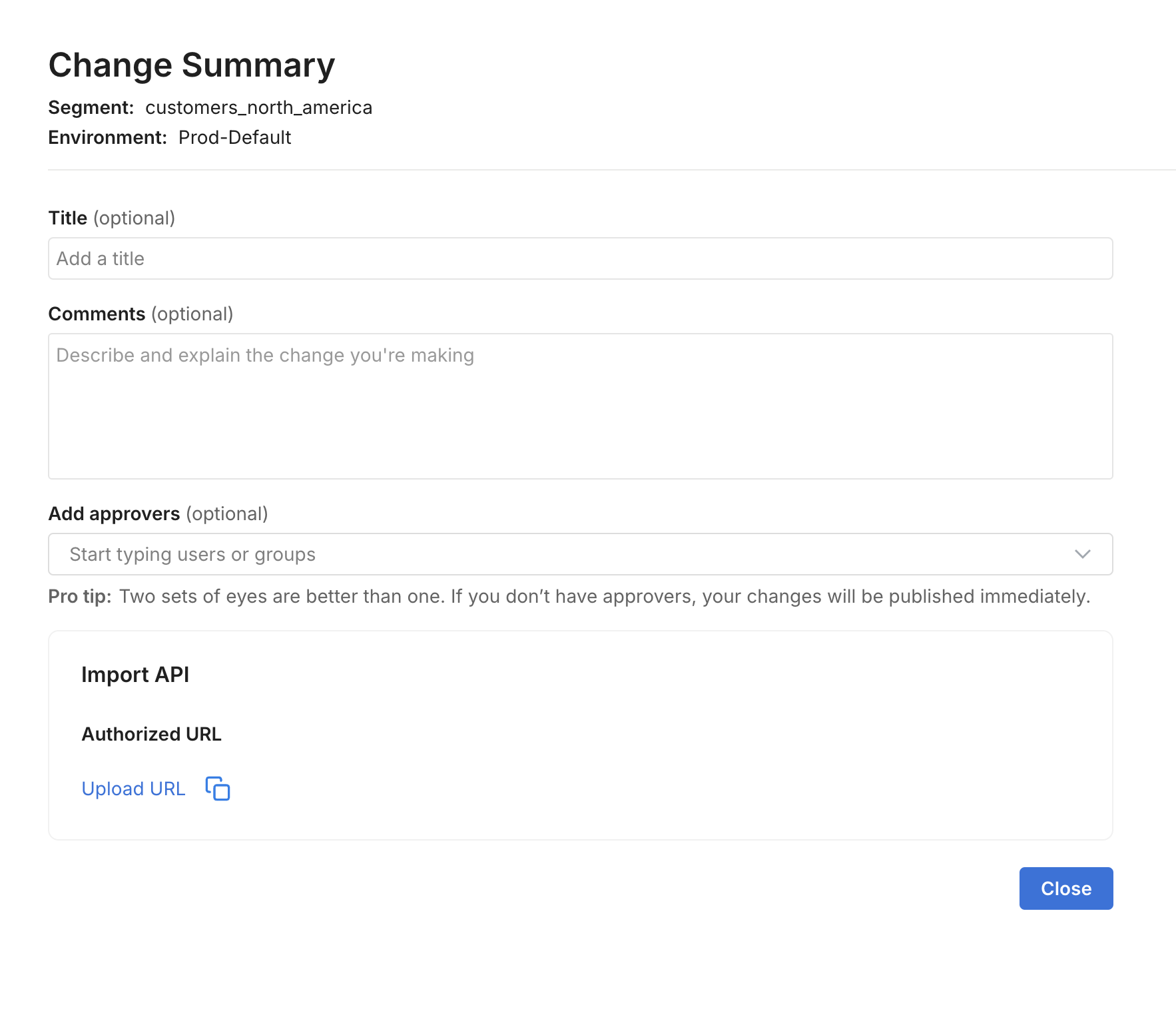 On the Change summary page, click Save to generate an upload URL.