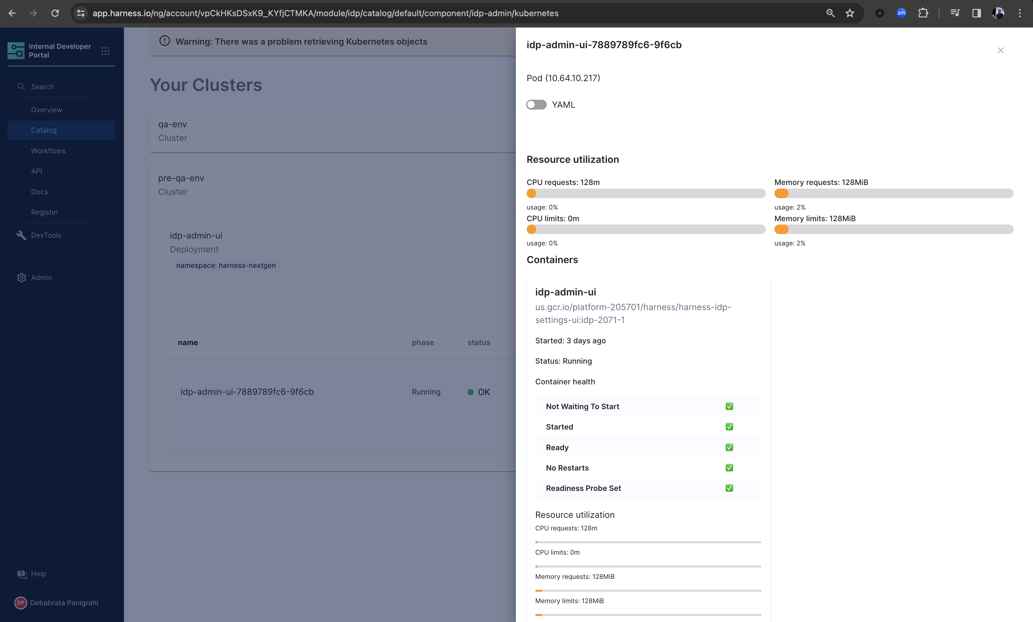 You can as well have a detailed view of your containers and pods, including the YAML view.