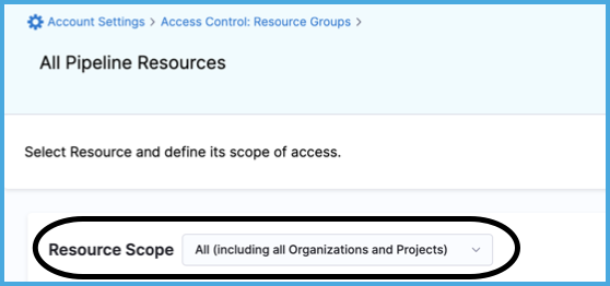 For Resource Scope, select All (including all Organizations and Projects). This means the resource group grants access to the specified resources at the account level and in all organizations and projects under the account.