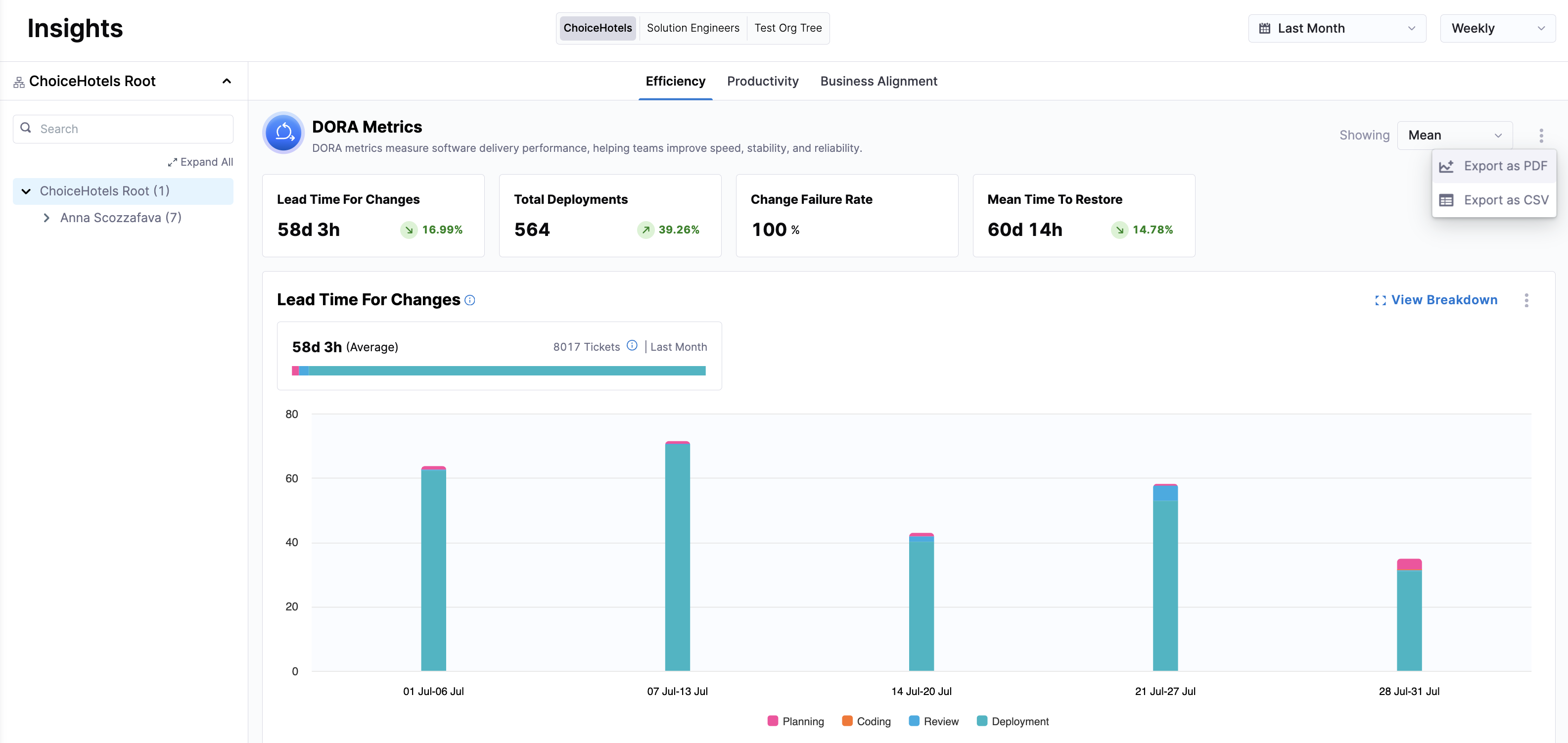 Exporting SEI 2.0 Insights allows you to download and share insights from the SEI 2.0 platform in both PDF and CSV formats. This feature is designed to facilitate the sharing of key performance metrics and insights across teams and stakeholders, enabling better decision-making and performance tracking.