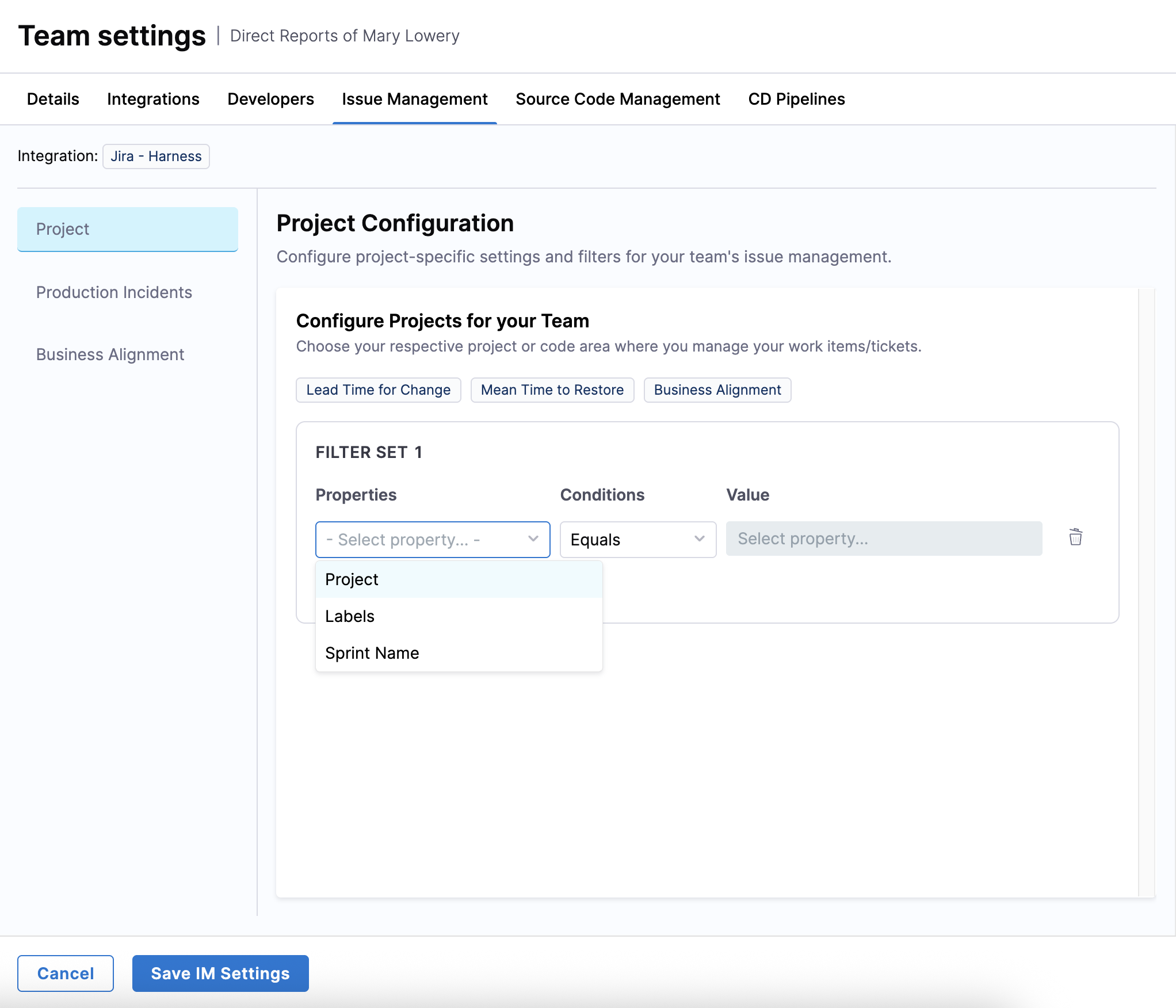 Create a filter set by adding conditions to define criteria for your team's issue management system on the Projects tab.